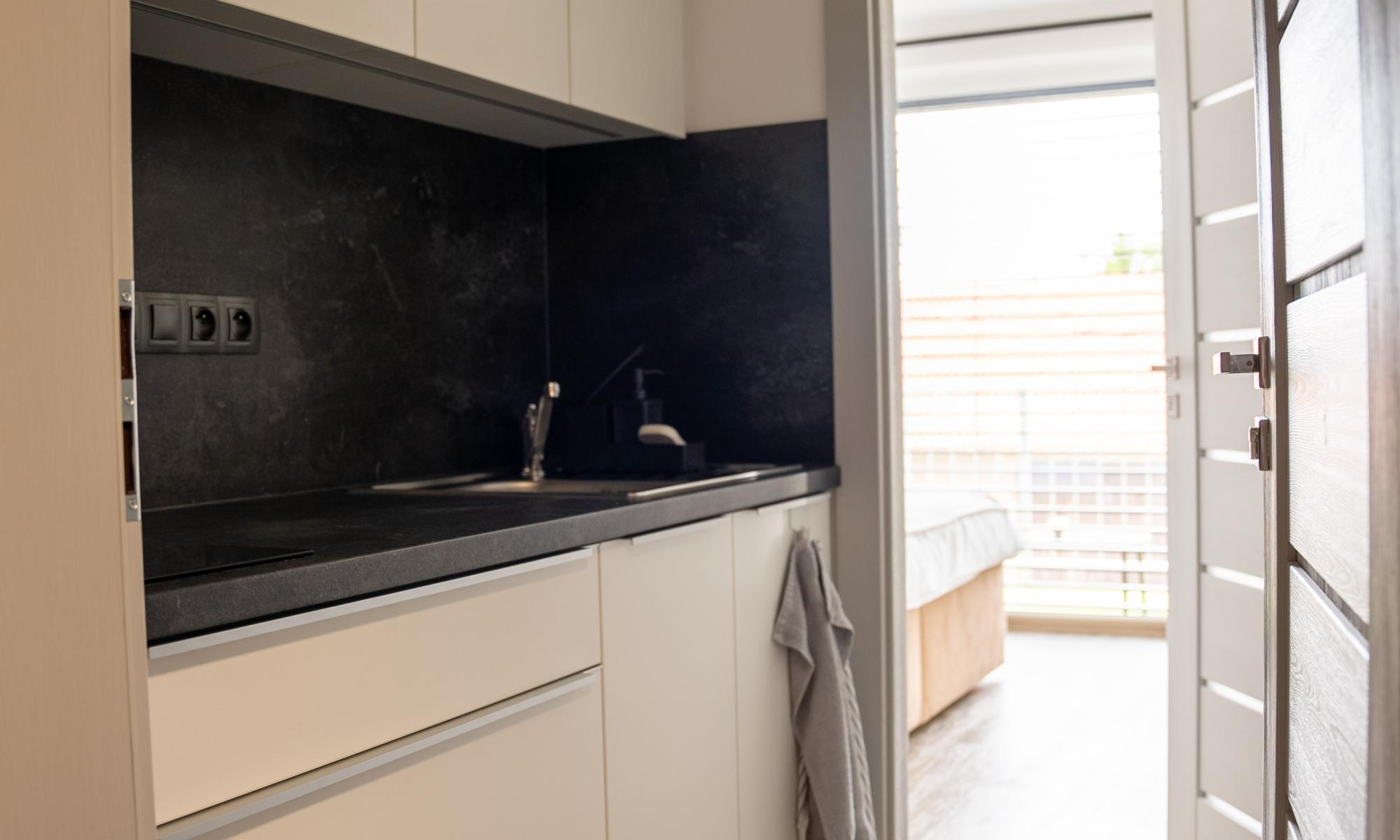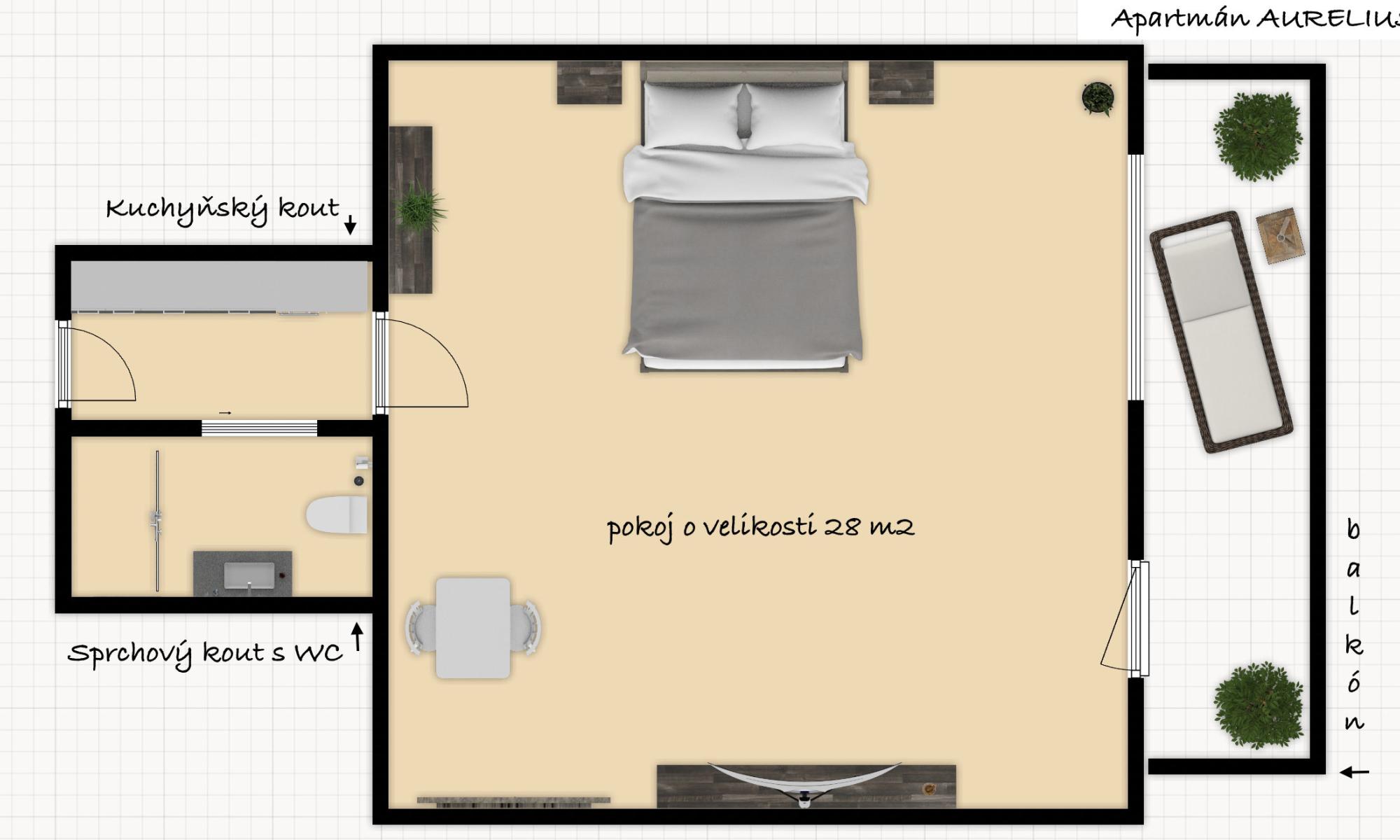 Apartmán o velikosti 28 m2 je vhodný pro 2 až 3 osoby. Dominantu tvoří největší balkón kde si můžete užít jak ranní kávu tak večerní sklenku vína. Apartmán má vlastní koupelnu s prostorným sprchovým koutem, WC a kuchyňský kout.