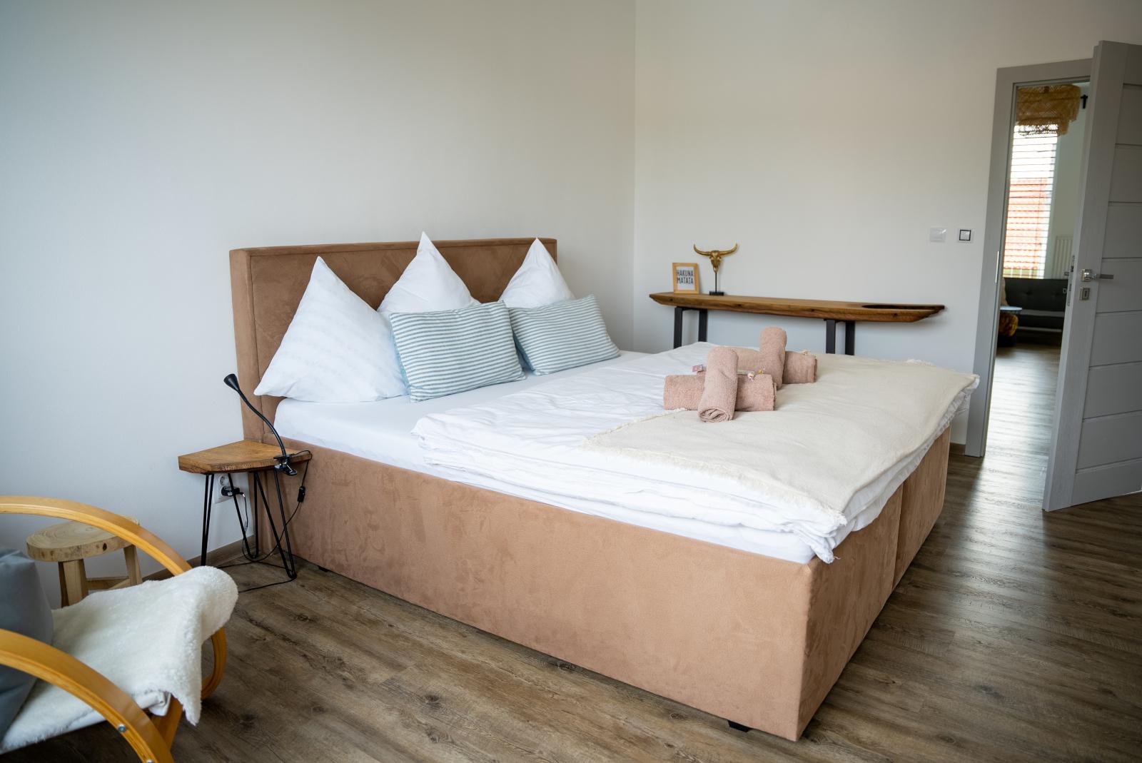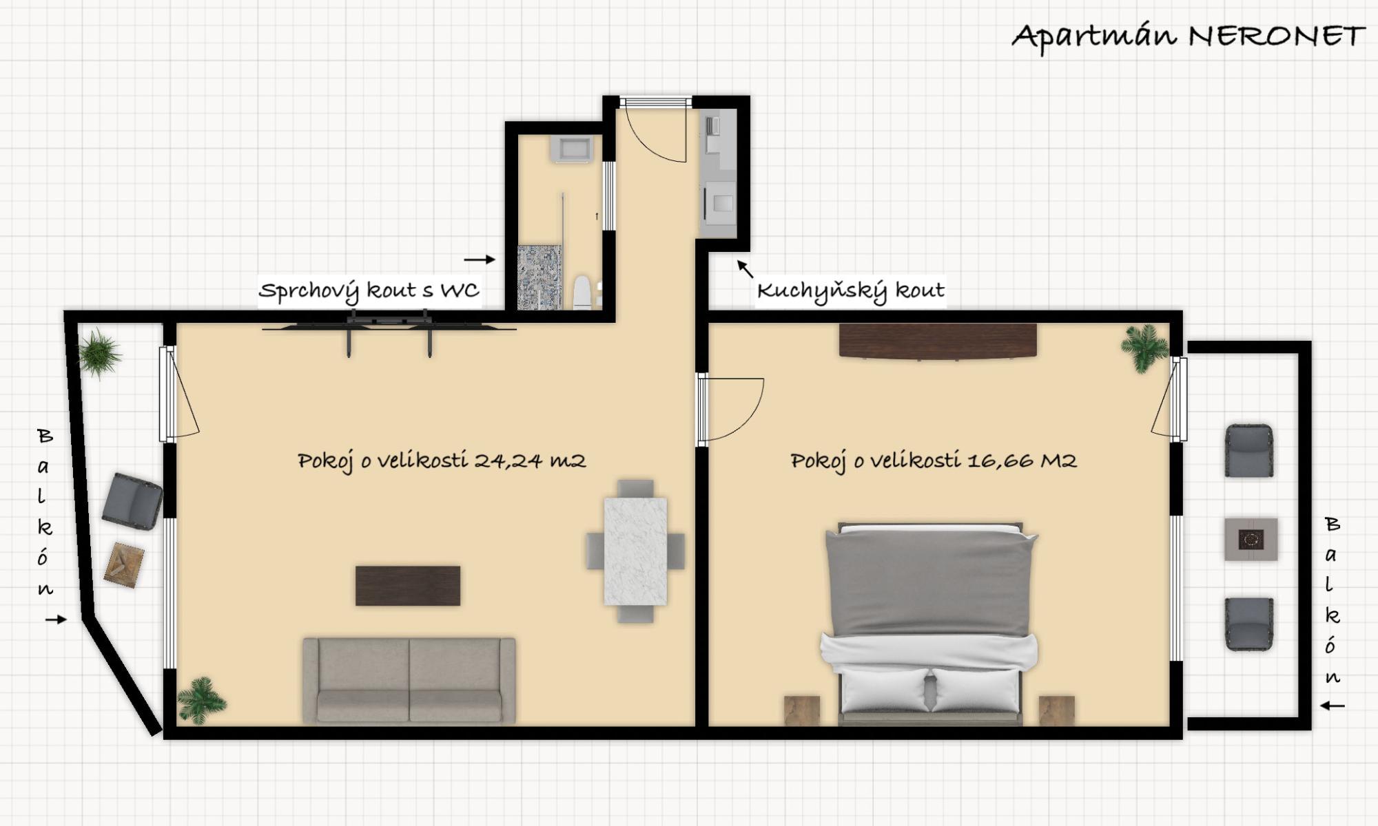 Apartmán o velikosti 48 m2 je největším, který nabízíme. Kapacitně pojme 5 až 6 osob. Výhled z balkonu má na obě strany jak na vinice tak i do ulice. Ložnice průchozí do obývací zóny kde se nachází jídelní stůl, gauč a kanape. Samozřejmostí je vlastní koupelna s prostorným sprchovým koutem. WC a kuchyňský kout.